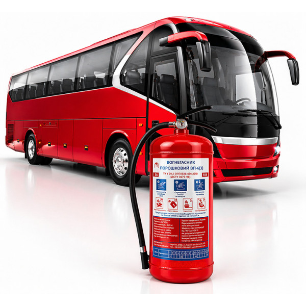 - Автобусы оборудуются двумя порошковыми огнетушителями массой не менее 5 кг ОП-5(ВП-5),ОП-6(ВП-6),ОП-9(ВП-9). Огнетушители размещены: один в кабине водителя, другой в салоне. Огнетушители для автобусов следует защищать от воздействия осадков, солнечных лучей и грязи.