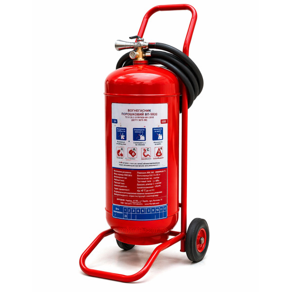 Вогнегасник порошковий ВП-50(ОП-50) — це пересувний порошковий вогнегасник закачного типу, призначений для гасіння пожеж класів A, B, C та електроустановок під напругою згідно з маркуванням і паспортом виробу. На відміну від переносних моделей, вогнегасник порошковий ВП-50(ОП-50) встановлений на візку, завдяки чому його можна оперативно підкотити до зони ризику та подати суттєво більший обсяг вогнегасної речовини.